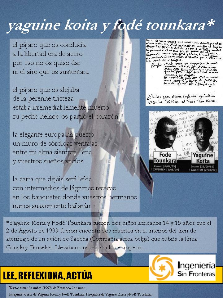 El 2 de Agosto de 1999 dos niños africanos llamados Yaguine Koita y Fodé Tounkara, de 14 y 15 años de edad, fueron encontrados muertos en el interior del tren de aterrizaje de un avión que cubría la línea Conakry-Bruselas. Ocultos en tan peligroso habitáculo, cual polizones de su propio ataúd, habían perecido congelados sin ver cumplidos sus sueños.