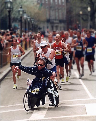 Durante los últimos 20 años, Dick, de 65 años, ha empujado y jalado a su hijo por todo el país, pasando sobre cientas líneas de meta. Cuando Dick corre, Rick está en una silla de ruedas que Dick va empujando. Cuando Dick va en bicicleta, Rick están en un asiento especial sujeto al frente de la misma. Cuando Dick nada, Rick está en una pequeña pero pesada balsa, estabilizada firmemente, que es jalada por Dick.