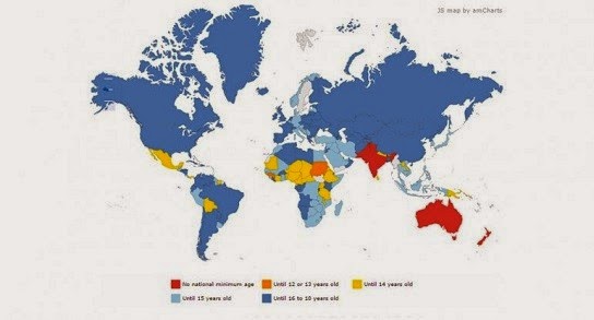 Este mapa elaborado por el Centro de Análisis de Políticas Mundiales, los clasifica según la edad máxima en que los niños están protegidos de trabajar a tiempo completo.