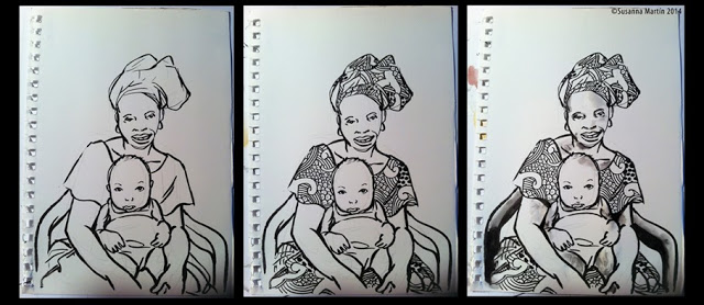 “En cada trabajo que realizo intento siempre superar el anterior –afirma Susanna-. Registros que usé en el cómic Sonrisas de Bombay aquí los he intentado mejorar. El principal problema ha sido el no haber viajado allí y no conocer nada de la cultura senegalesa. A pesar del gran número de fotos que me pasó Isabel de su viaje, los ojos eran otros; yo necesitaba detalles cotidianos como los tipos de envase, los gestos, el olor y los colores, los sonidos de la calle…”.