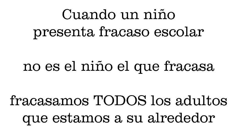 El fracaso escolar es uno de los grandes problemas que está sacudiendo nuestro sistema educativo actual. En nuestro país aproximadamente uno de cada cuatro niños fracasa en sus estudios con las dificultades y consecuencias que esto acarrea. Cuando hablamos de fracaso escolar hemos de tener muy en cuenta lo que afirma la frase de la imagen anterior: que TODOS y cada uno de los integrantes del sistema educativo debemos asumir nuestra parte de culpa y responsabilidad en el problema. Pues como muy bien destaca el texto: FRACASAMOS TODOS LOS ADULTOS QUE ESTAMOS A SU ALREDEDOR porque cuando hablamos de fracaso escolar las miradas no pueden dirigirse únicamente a la escuela, hay muchas cosas que están fallando…