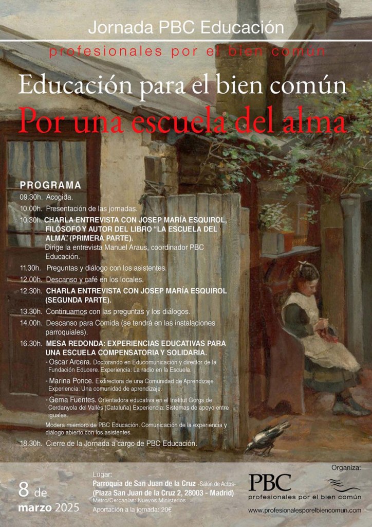 10:30h. Charla entrevista con Josep María Esquirol, filósofo y autor del libro “La escuela del alma”. (Primera parte). Dirige la entrevista: Manuel Araus, coordinador PBC Educación.